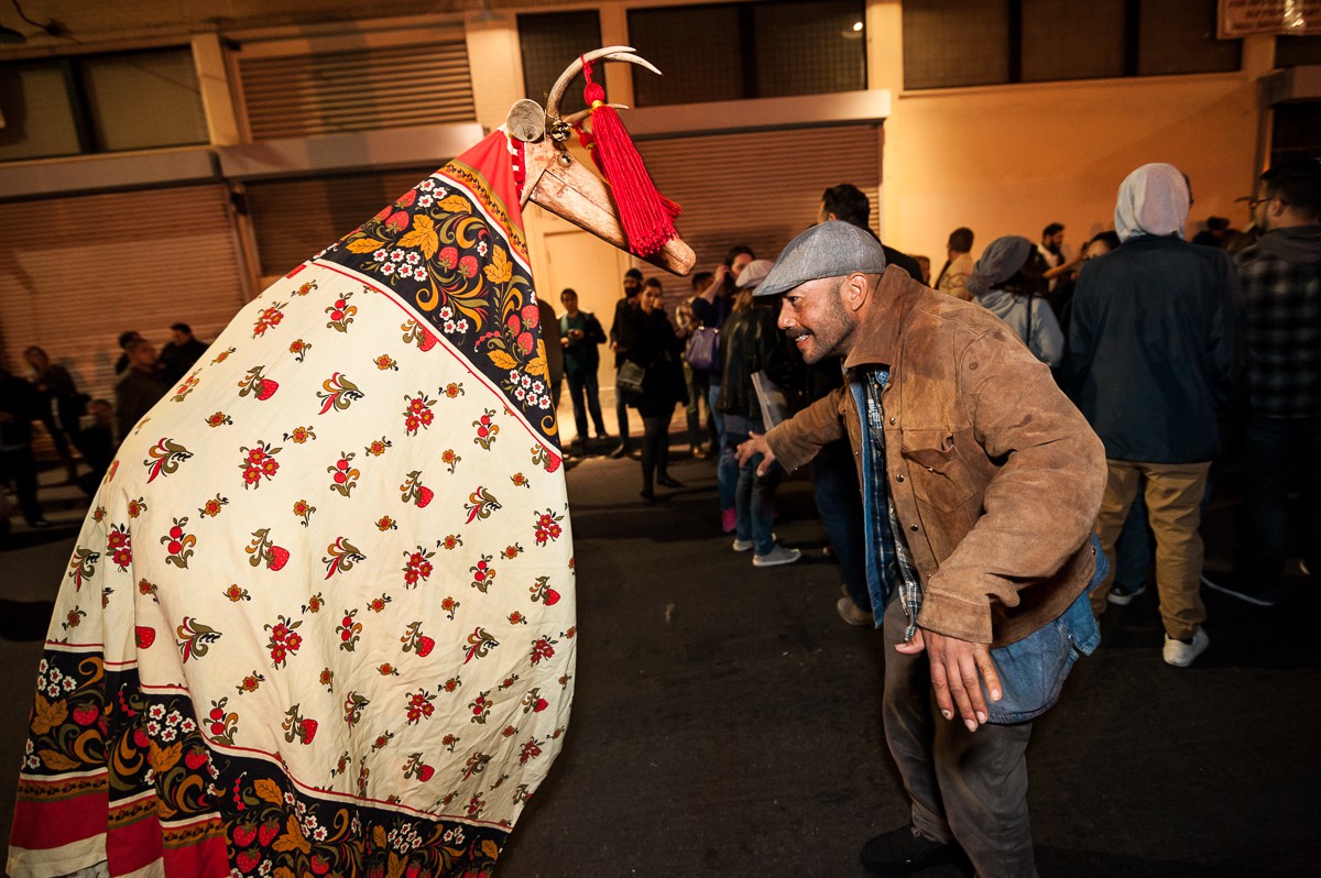 LA troupe “Habergeiss” (Alpine demon goat) puppet 2016 LA Krampus Run (at Downtown Art Walk). Photo; Vern Evans (vernevansphoto.com)