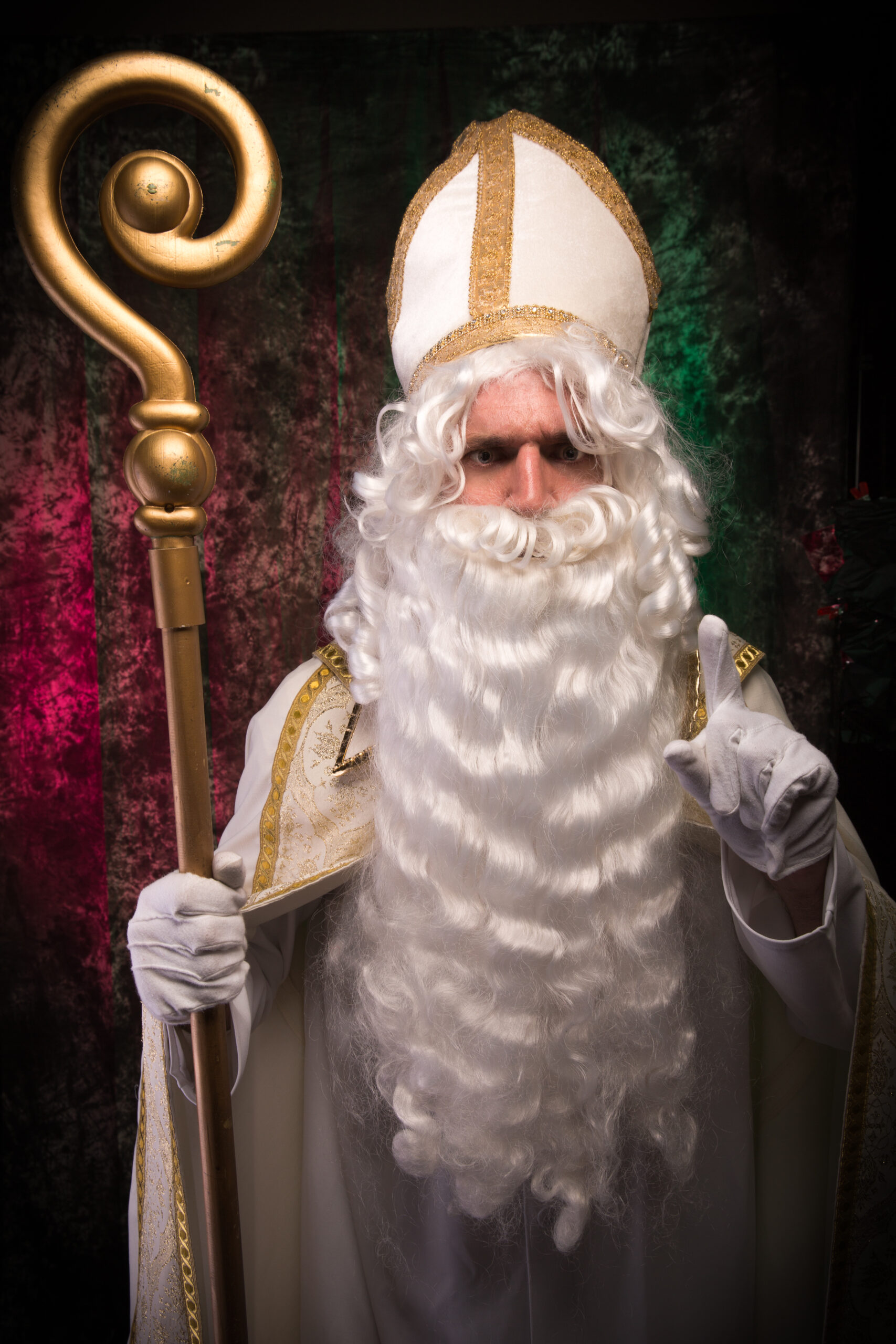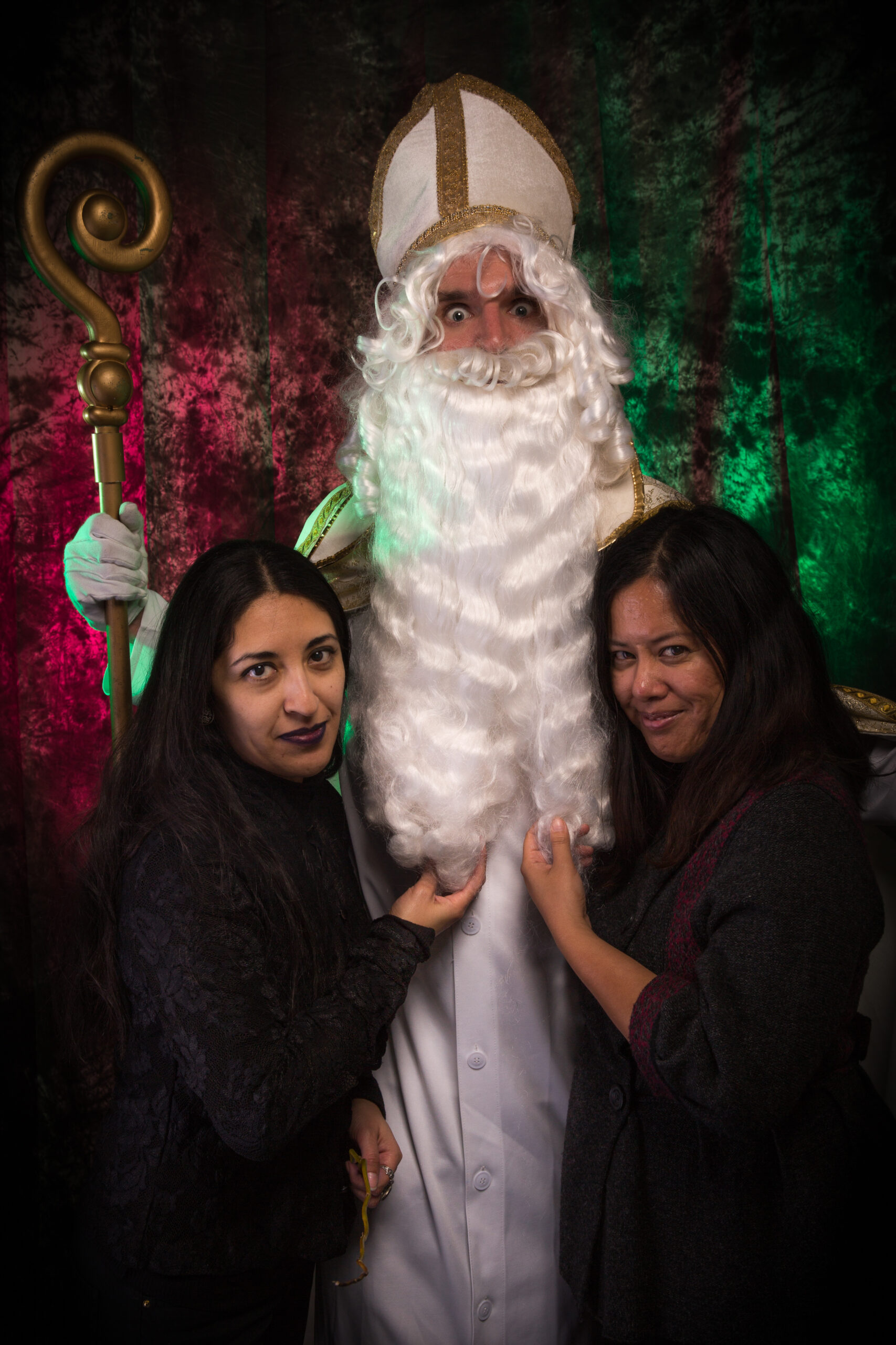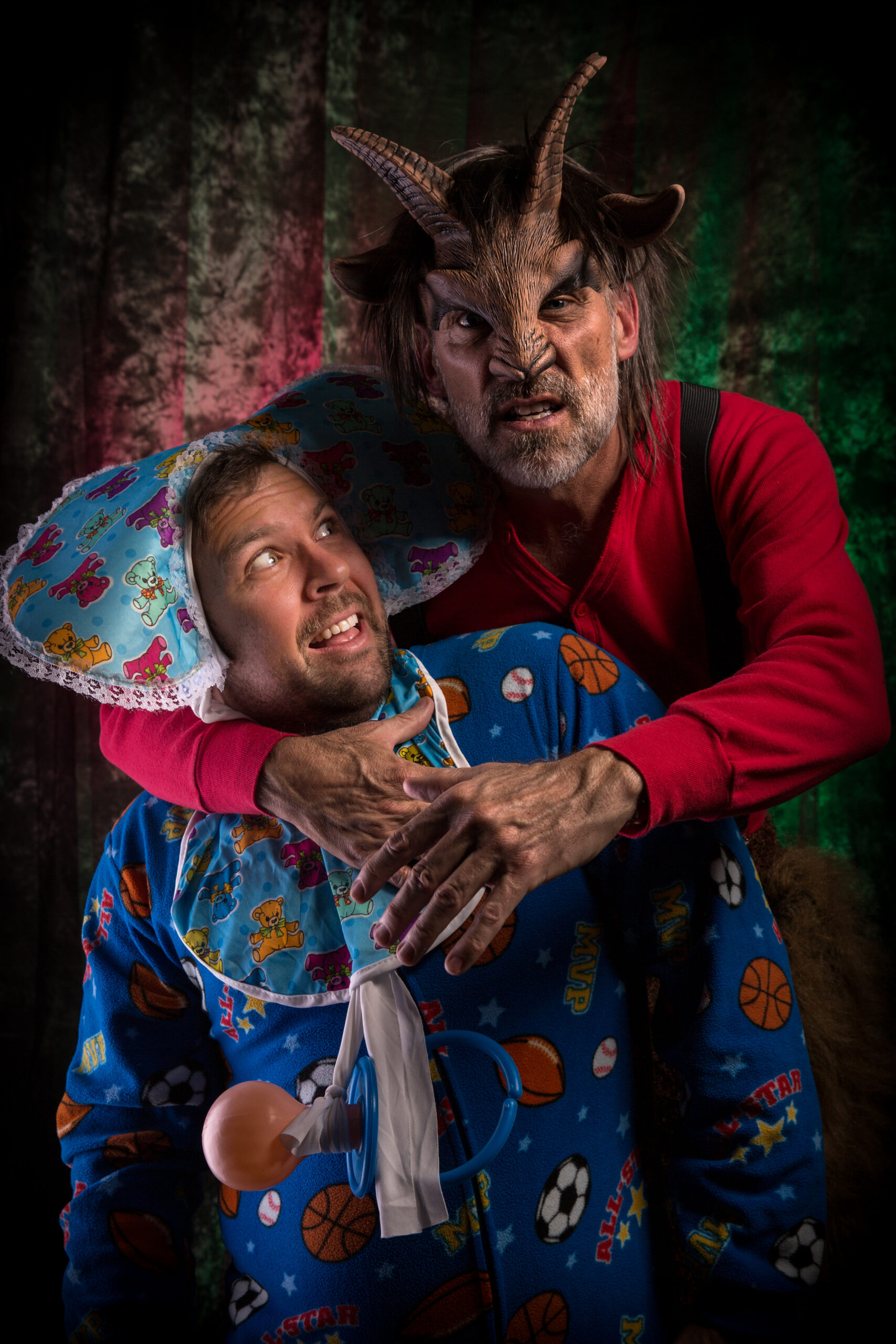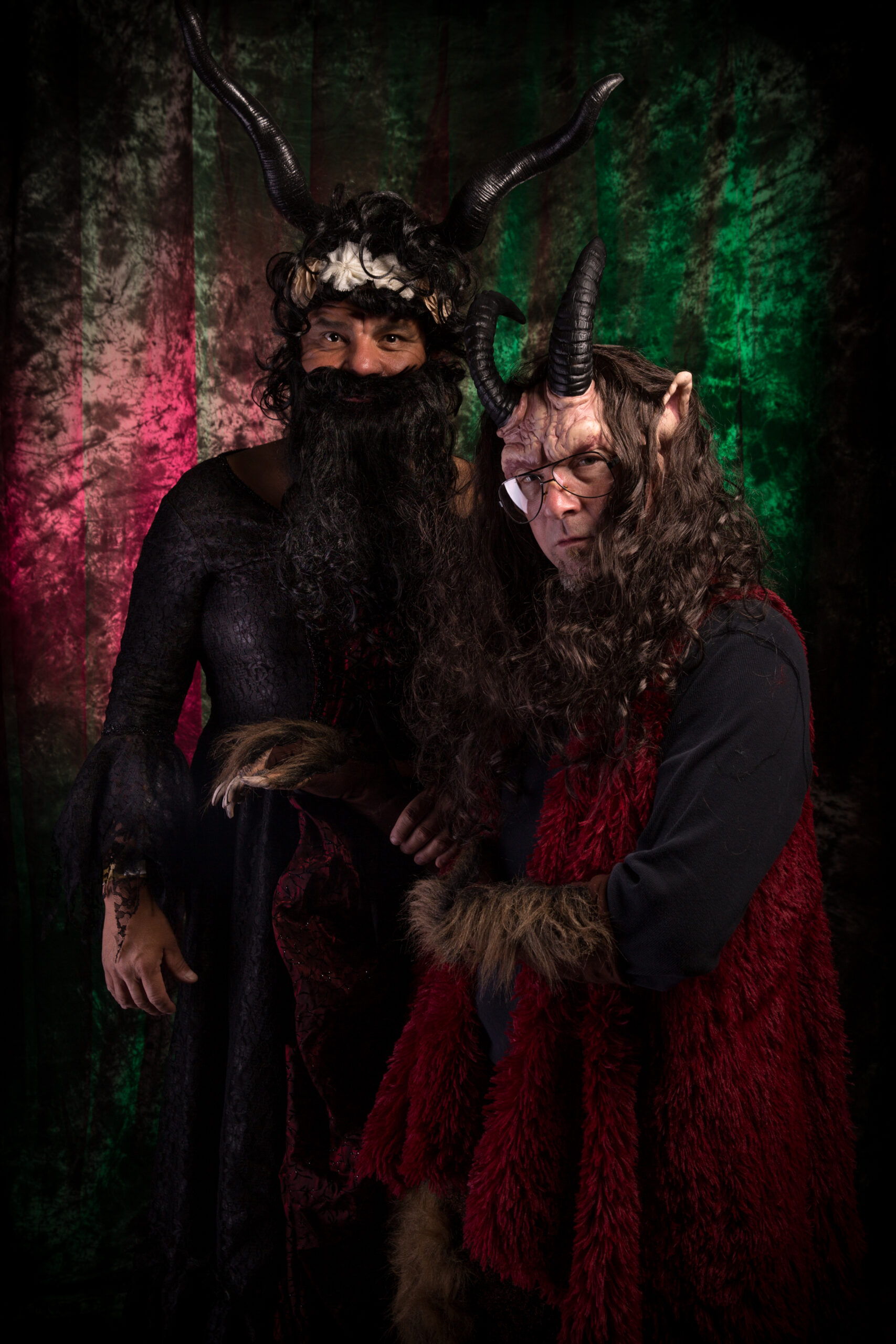 Michael Perrick (priest) and Rick Galiher (St. Nicholas) from 2016 Krampus Play (at Church of the Angels). Photo; Vern Evans (vernevansphoto.com)